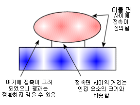- 두 접촉 면 사이의 거리가 인접 요소 크기보다 작거나 같을 때 결과가 가장 정확합니다. 아래 그림의 예는 부정확한 결과를 낼 수 있습니다.