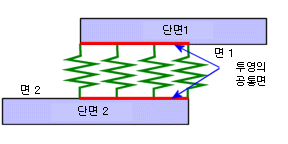 - 스프링이 다른 바디의 면 위에 한 바디의 면을 투영한 공통 영역에 적용됩니다. 공통 영역이 없을 경우, 소프트웨어가 스프링을 작성할 수 없습니다.