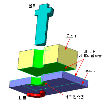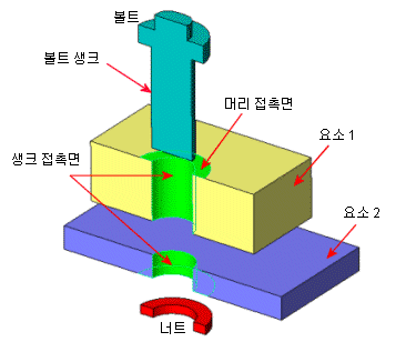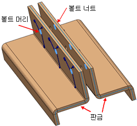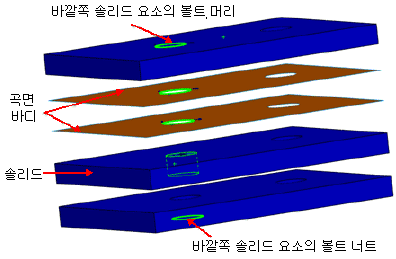 가 연결합니다. 솔리드, 쉘, 판금 바디가 혼합된 스택을 통해 볼트를 정의할 수 있습니다. 같은 부품의 요소를 선택하여 볼트를 정의할 수도 있습니다.