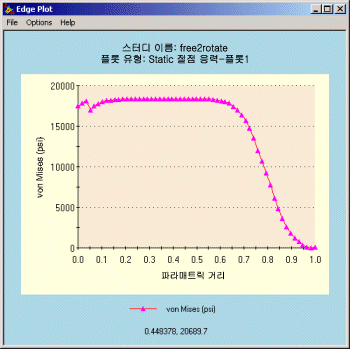 선택한 모델 모서리에서의 원하는 결과를 2D 그래프로 작성할 수 있습니다. 이 그래프에는 결과(Y축)와 선택한 모서리의 파라매트릭 거리(X축)가 표시됩니다. 이 옵션은 하나의 모서리만 선택한 경우에만 사용할 수 있습니다.