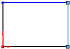 스케치를 시작할 때, 스케치 요소를 끌어 그 모양이나 위치를 변경할 수 있습니다. 이 직사각형에서는, 왼쪽 검정색 모서리선과 바닥선은 원점에 고정되어 있으나 윗변과 오른쪽 변은 끌어 이동할 수 있습니다. 파란 색 선은 요소가 아직 고정되지 않았음을 표시하며, 연청색은 요소가 선택되었음을 표시합니다.