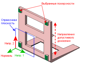 Используя справочную плоскость (показана синим) вилочного захвата, можно применять ограничения к выбранным граням (показаны темно-зеленым) вдоль напр. 1 и направления перпендикуляра (показаны светло-зеленым). Это оставляет выбранные грани свободными для перемещения вдоль напр. 2 (показано красным).