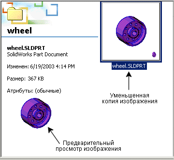 Используйте Проводник Windows для просмотра уменьшенных копий изображений, а также чтобы получить доступ к информации о свойствах пользователя для документов SolidWorks.