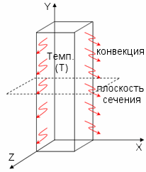 На рисунке показан пример длинного алюминиевого блока при равномерной температуре, который был неожиданно подвергнут действию конвекции окружающей среды. Можно создать сечение, параллельное плоскости XZ, и затем применить равномерную температуру к прямоугольному поперечному сечению и нагрузку конвекции к внешней кромке прямоугольника.