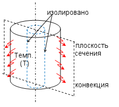 На рисунке показан пример полого цилиндра с изолированной внутренней поверхностью, подвергнутого действию конвекции окружающей среды на внешнюю плоскость. Можно выбрать любую плоскость сечения, на которой расположена ось вращения.