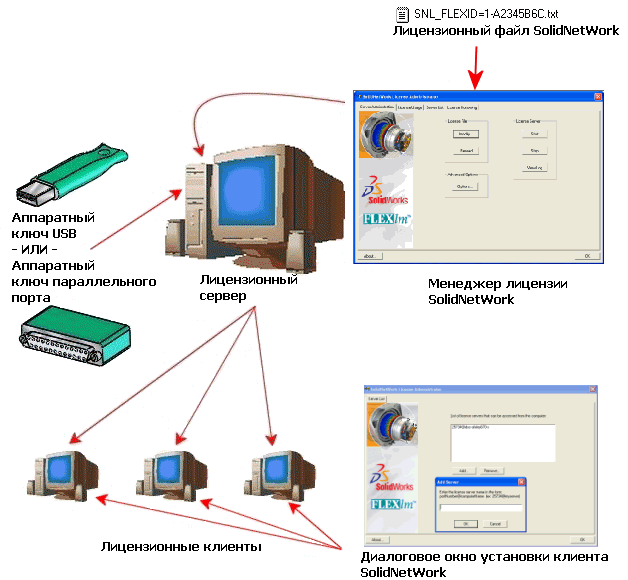 На данном рисунке проиллюстрирован обычный процесс установки лицензии SolidNetWork.