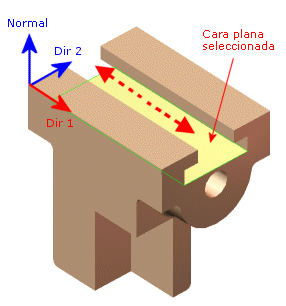 Esta opción se puede usar sólo cuando todas las caras seleccionadas son planas. Cada cara puede estar en un plano diferente y restringirse con relación a sus propias direcciones (Dirección 1, Dirección 2 y Normal).