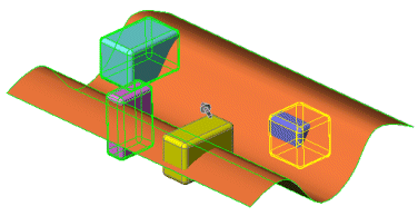 • 选择实体。 曲面只切除您用指针所选择的实体。 如果您将被切除曲面所交叉的新实体添加到模型上,用右键单击并选择编辑特征,然后选取这些实体将它们添加到所选实体清单中。 如果您不将新实体添加到所选实体清单中,则它们将保持完整无损。