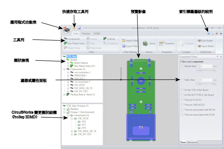 當您從 SolidWorks 開啟 ECAD 檔案時,將會出現 CircuitWorks 視窗。使用此介面開啟、比較與儲存 ECAD 檔案,過濾特徵以減少複雜性,修改 ECAD 屬性,以及建立 SolidWorks 零件與組合件模型。