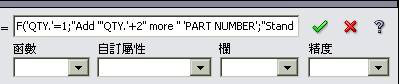 6. 輸入字串及欄表頭來完成計算的定義,使其看起來如下:IF('QTY.'=1;"Add "'QTY.'+2" more " 'PART NUMBER';"Standard")