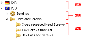左側窗格的 Toolbox 標準樹狀結構除了您定義的自訂資料夾與零組件,也列出標準、類別與類型。