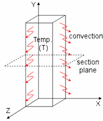 Obrázek znázorňuje příklad dlouhého bloku, udržovaného při konstantní teplotě a náhle vystaveného konvekčnímu prostředí.