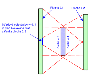 Záření mezi dvěma elementárními plochami může být blokováno třetí elementární plochou. V takovém případě je faktor zobrazení 0. Software automaticky uvažuje blokování mezi všemi vybranými plochami dle následujícího obrázku. Pro správnou funkci blokování je nutné vybrat plochy účastnící se záření. Na následujícím příkladu plochy 3 a 4 částečně blokují záření mezi plochami 1 a 2. Pokud vyberete pouze plochy 1, 2 a 3, získáte nesprávné výsledky.