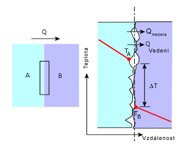 Kvůli rozhraní mezi dvěma kontaktními plochami existují dva režimy převodu tepla. Prvním je vedení body kontaktu těles (Qvedení), které je velmi účinné. Druhým je vedení mezerami vyplněnými plynem (Qmezery), které může být kvůli své nízké tepelné vodivosti velmi špatné. Pro ošetření tepelného kontaktního odporu je umístěn do série s vodícími médii na obě strany přenos tepla mezi plochami hc dle následujícího obrázku.