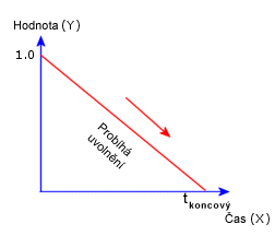 Násobitel zatížení (hodnota Y) se snižuje z 1 v čase 0 na 0 v čase tkoncový, kde je tkoncový koncový čas nelineární analýzy nebo celkový čas přechodné tepelné analýzy.