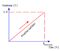 Násobitel zatížení (hodnota Y) se zvyšuje z 0 v čase 0 na 1 v čase tkoncový, kde tkoncový je koncový čas nelineární analýzy nebo celkový čas přechodové tepelné analýzy.