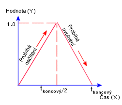 Násobitel zatížení (hodnota Y) se zvyšuje z 0 v čase 0 na 1 v čase tkoncový/2 a potom se snižuje na hodnotu 0 v čase tkoncový, kde tkoncový je koncový čas nelineární analýzy nebo celkový čas přechodné tepelné analýzy.