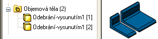 Počet objemových těl v dokumentu dílu je uveden v závorkách vedle pole Objemová těla. Pokud je z téhož prvku vytvořeno několik těl, objeví se počet instancí v hranatých závorkách za každou instancí v seznamu Objemová těla. Například, následující díl obsahuje dvě objemová těla vytvořená z jednoho odebrání vysunutím: