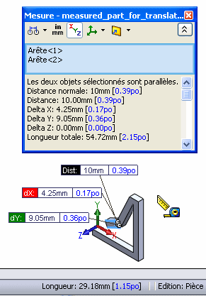 Vous pouvez configurer l'outil Mesurer de sorte qu'il affiche deux unités de mesure. Par exemple, vous pouvez spécifier les millimètres et les pouces pour affichage dans la boîte de dialogue Mesurer, les textes de mesure et la barre d'état.