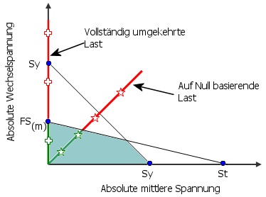 FS(m) = Modifizierte Dauerfestigkeit des Materials, Sy = Fließspannung des Materials, St = Zugfestigkeit des Materials