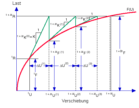 Bei einer nicht-linearen statischen Analyse lautet der grundlegende Gleichungssatz, der in jedem Zeitschritt t+Δt zu lösen ist, folgendermaßen:
