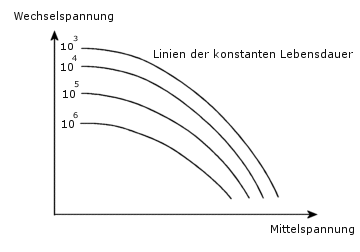 Die Auswirkung von Mittelspannungen auf die Anzahl der Zyklen bis zum Versagen wird durch das folgende Diagramm, das so genannte Haigh-Diagramm, veranschaulicht.