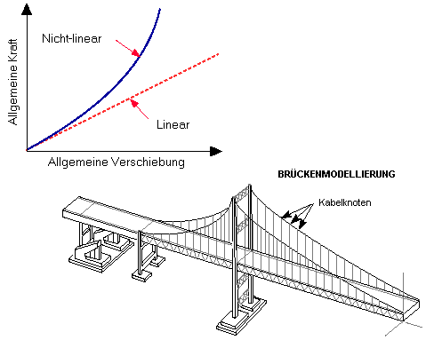 So zeigen beispielsweise kabelähnliche Konstruktionen generell beim Erhöhen der angewendeten Lasten ein Verhalten in Richtung Versteifung, während Bögen zuerst ein Verhalten in Richtung Erweichung und dann in Richtung Versteifung zeigen. Dieses Verhalten ist weithin unter der Bezeichnung Snap-Through-Verhalten bekannt.