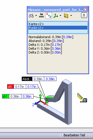 Sie können das Werkzeug Messen so konfigurieren, dass die Ergebnisse in zwei unterschiedlichen Maßeinheiten angegeben werden. So können Sie z. B. festlegen, dass die Messdaten im Dialogfeld Messen, in Beschreibungen und in der Statusleiste sowohl in Millimeter als auch in Zoll angezeigt werden.