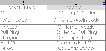 In diesem Beispiel wird die Komponentendateiposition in einer Stücklistentabelle durch die Kombination der Eigenschaften SW-Ordnername und SW-Dateiname angezeigt.