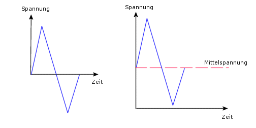 Die Wechselspannungsamplitude für einen Spannungszyklus ergibt sich aus der Hälfte des Spannungsbereichs im Zyklus. Der durch einen Spannungszyklus verursachte Schadensumfang hängt nicht nur von der Wechselspannung, sondern auch von der Mittelspannung ab. Zum Beispiel haben die beiden unten dargestellten Zyklen dieselbe Wechselspannung. Da sie aber unterschiedliche Mittelspannungswerte aufweisen, verursachen sie verschiedene Schadensbeträge.