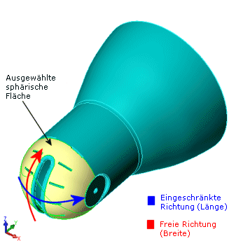 Die Radial-, Längen- und Breitenrichtungen einer kugelförmigen Fläche sind in der Abbildung dargestellt. Verwenden Sie die Option Vorschau anzeigen, um die Längen- und Breitenrichtungen zu bestimmen.