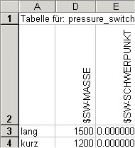 In einer Tabelle können Sie Werte für Masse und Massenschwerpunkt zuweisen. Für die Spaltenüberschriften in einer Tabelle zur Zuweisung von Masse und Massenschwerpunkt gilt folgende Syntax: