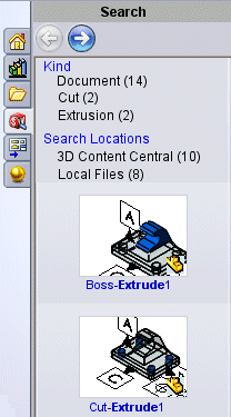 (Search) タブに表示されます。サムネイルをSolidWorksファイルにドラッグし、分析されたエンティティを再生成します。