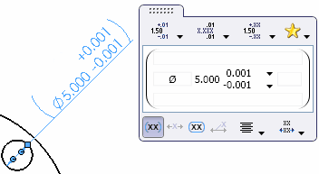ポインタの右上に表示されます。ポインタをボタン上に置くと寸法パレットが表示されます。パレット内をクリックし、表示を固定します。寸法パレットは、ポインタがグラフィックス領域外に移動されたり、他の方法で寸法が選択解除された場合(例えばグラフィックス領域内をクリックした場合など)に非表示になります。寸法パレットはオフに設定できる 状況依存ツールバー です。