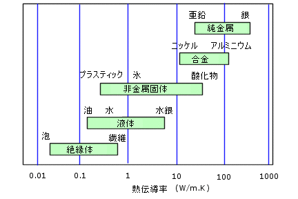 この図は、液体、非金属固体、および純金属の常温と常圧における熱伝導率の値の範囲を示しています。