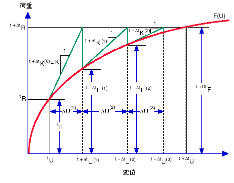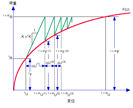 この手法では、下の図のように正接剛性マトリクスが、特定のステップまでの各反復で生成されて分解されます。NR 法は、高い収束率を持ち、その収束率は二次方程式です。ただし、正接剛性は各反復で生成されて分解されるため、大きなモデルの場合は非常に高価になるので、他の反復法の方が有効かもしれません。