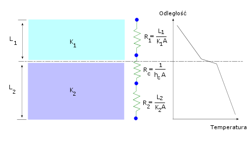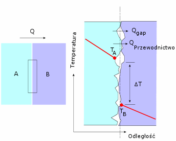 Poprzez powierzchnię styku dwóch ścian istnieją dwa rodzaje przekazywania ciepła: Pierwszym jest przewodzenie przez punkty styku ciał stałych (Qprzew.), które jest bardzo dobre. Drugim jest przewodzenie przez przerwy wypełnione gazem (Qszczel.), które może być bardzo słabe ze względu na niski współczynnik przewodzenia ciepła. Aby opisać kontaktowy opór cieplny, szeregowo z ośrodkami przewodzącymi po obydwu stronach włączona została konduktancja międzyfazowa hc, jak na poniższym rysunku.