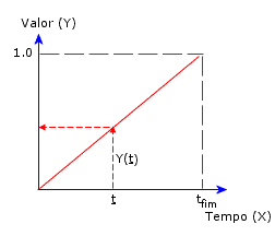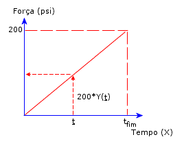 Você define os pares X e Y ou os lê de um arquivo de texto. O valor Y da curva de tempo é um multiplicador para a quantidade associada. Por exemplo, uma força de 200 psi associada à curva de tempo A especifica uma força, como ilustrado na curva B. Em qualquer momento determinado (t), o valor da força que é aplicada pelo programa é a magnitude de força especificada vezes o valor de Y da curva A, naquele momento determinado (t) Você pode definir até 5.000 pontos.
