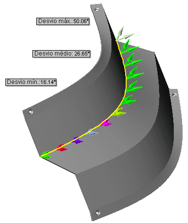 A ferramenta Análise de desvio é uma ferramenta de diagnóstico que calcula o ângulo entre as faces. É possível selecionar uma ou várias arestas. Elas podem ficar entre as faces de uma superfície ou em qualquer aresta de um sólido.