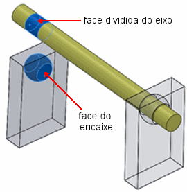 Quando os componentes que suportam um eixo não são mais rígidos do que o próprio eixo, você não deve usar um acessório de fixação de rolamento. Em vez disso, use um conector de rolamento entre o eixo e o encaixe. No exemplo abaixo, os conectores de rolamento estão definidos entre faces cilíndricas do eixo e faces esféricas do encaixe.