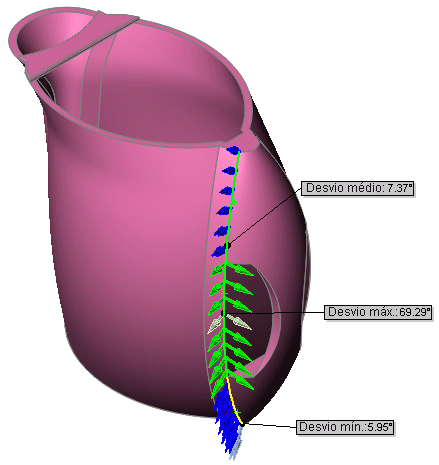 A ferramenta Análise de desvio é uma ferramenta de diagnóstico que calcula o ângulo entre as faces. É possível selecionar uma ou várias arestas. Elas podem ficar entre as faces de uma superfície ou em qualquer aresta de um sólido.