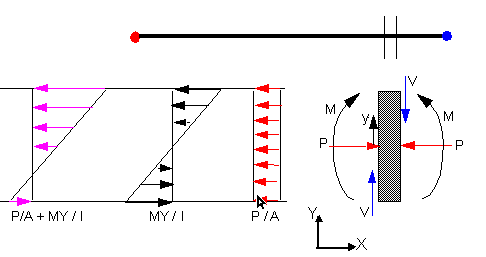 Quando a opção Renderizar perfil de viga é desmarcada, o software calcula valores de tensão nas fibras extremas de cada extremidade do eixo. Ele relata o valor de tensão com a maior magnitude para cada segmento da viga.