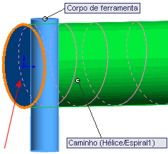 Para manter o corpo de ferramenta perpendicular a uma referência enquanto segue um caminho em hélice, selecione Vetor de direção para Tipo de alinhamento do caminho, depois selecione a direção à qual o corpo de ferramenta deve permanecer perpendicular, por exemplo, a face normal à plana de um cilindro.
