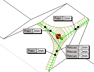 Filete de recuo mostrado com Visualização completa e a mesma Distância de recuo de 12 mm aplicada a todas as três arestas. Filete de recuo mostrado com Visualização completa e diferente Distância de recuo aplicada a todas as três arestas.