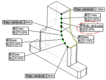 Você pode manipular e atribuir valores de raio aos pontos de controle entre os vértices de um filete de tamanho variável.