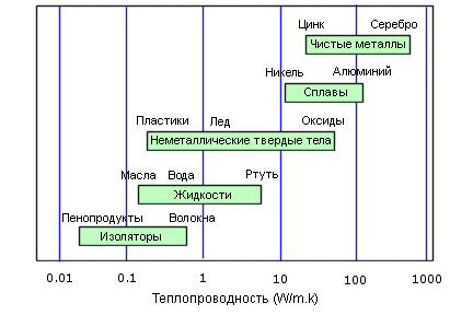 На рисунке ниже показан диапазон значений для теплопроводности жидкостей, неметаллических твердых тел и чистых металлов при нормальных температуре и давлении.