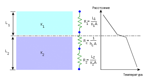 Проводимость hc подобна коэффициенту конвективной теплопередачи и имеет те же единицы измерения (Вт/м2 ºK). Если ΔT – разница температур по граничной области взаимодействия сред площадью A, то скорость переноса тепла Q задается равенством Q = A hc ΔT. Используя аналогию между теплом и электричеством, можно записать Q = ΔT/Rt, где Rt означает сопротивление термического контакта, задаваемое как Rt = 1/(A hc).