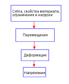 Если задана модель с сеткой и набором ограничений перемещения и нагрузок, то программа линейного статического анализа поступает следующим образом.
