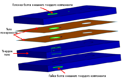 может соединять два компонента, несколько компонентов или компонент с основанием. Можно определить болты, проходящие через смешанный набор твердых тел, оболочек и тел из листового металла. Также можно определить болт, выбрав объекты одного и того же компонента.