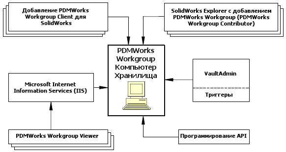 - Для установки клиентского интерфейса программирования приложений (API) установка сервера Workgroup PDM не требуется. Клиентский API устанавливается во время установки клиента Workgroup PDM.
